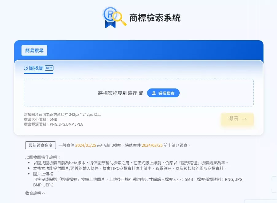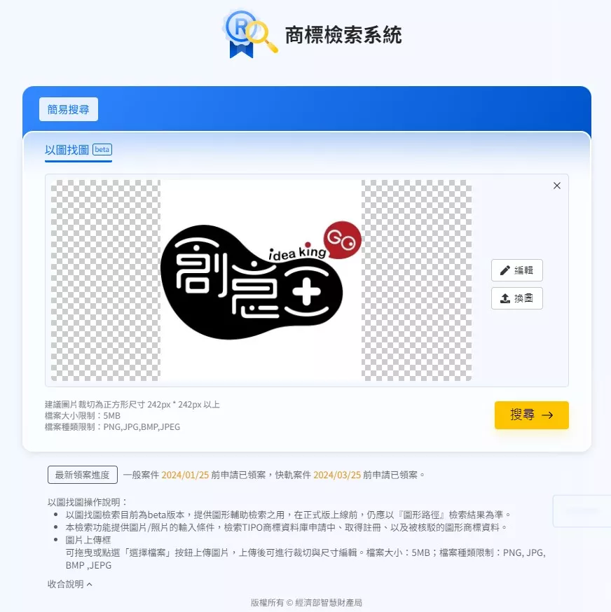 經濟部智慧財產局特別提醒:以圖找圖檢索功能還在試行階段,目前僅提供圖形輔助檢索之用,在正式版上線前,仍應以智慧局商標檢索系統之「圖形近似檢索」,設定「圖形路徑」、「商品或服務名稱」或「類似組群」後之檢索結果為準。