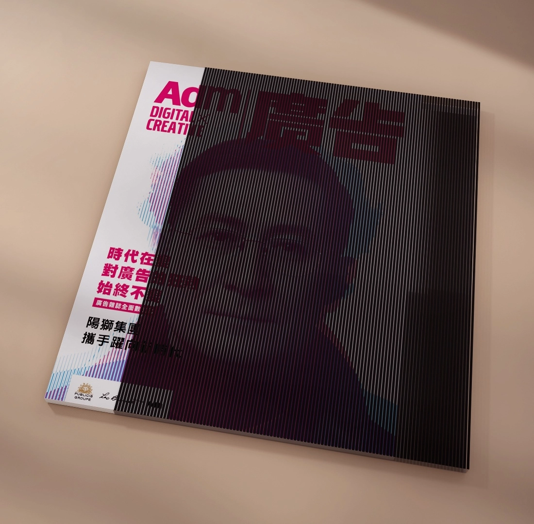 創意說明:一本重回手工時代的互動雜誌封面,我們透過最傳統繁複工序的格柵設計,讓讀者與雜誌封面產生互動,呈現段先生在不同人生時期的面貌,讓讀者在抽出雜誌的互動過程中,看見段董的年紀轉變,傳達「時代在變,對廣告的熱情不變。」透過AI修復並優化段董舊照品質,使其達到可印刷的解析度,並確保五官的準確呈現,再輔以光柵設計帶來的類3D效果,視覺呈現的是由青而壯、不同時期的段董,加以具光柵原理的外盒設計,讓讀者在抽出雜誌的互動過程中,看見段董的年紀轉變。以手工致敬不斷蛻變的數位時代。