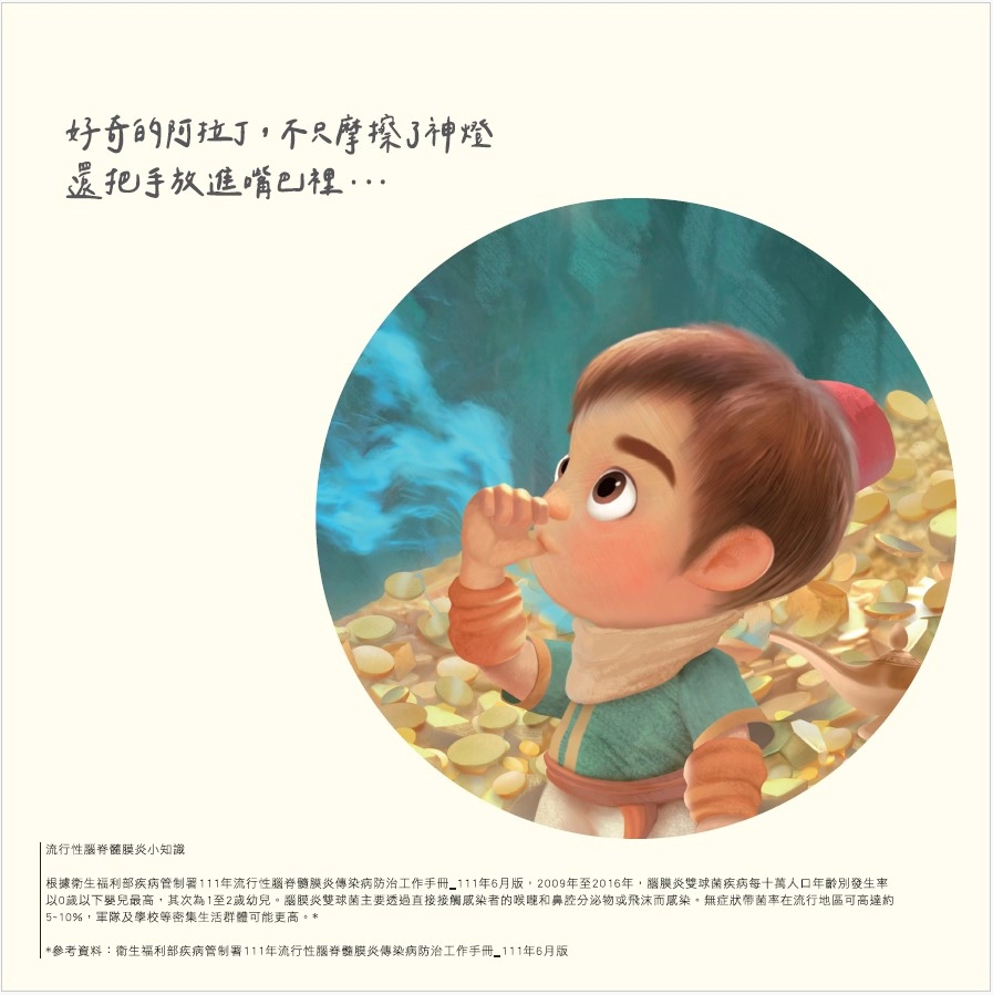 ↑ 第47屆時報金像獎「視覺設計類/印刷設計項」佳作:《腦膜炎衛教活動 然後就沒了》The End.阿拉丁篇。