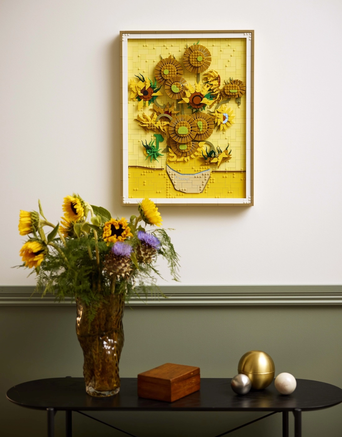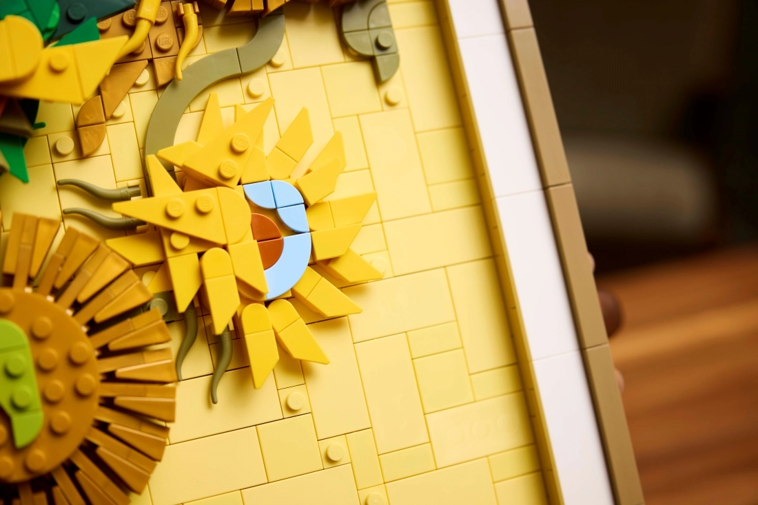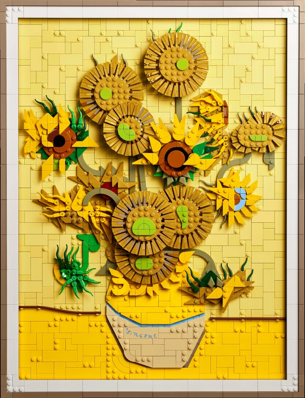這套由2615件零件組成的套裝讓粉絲們沉浸在梵高的藝術之中,並進一步了解他最受喜愛的畫作之一《向日葵》(1889年)背後的靈感。這套玩具經過精心設計,打造出3D磚塊版本,重點是三種鮮豔的黃色和梵谷著名的光影運用。套裝包括16朵花瓣可調節的向日葵畫、一個可拆卸的框架、一塊帶有梵高簽名的瓷磚和一個可展示的掛鉤。想像自己是一位站在一塊空白畫布前的畫家,受鮮豔色彩的啟發,藝術品透過添加一層又一層的細節來構建,直到樂高藝術向日葵栩栩如生。