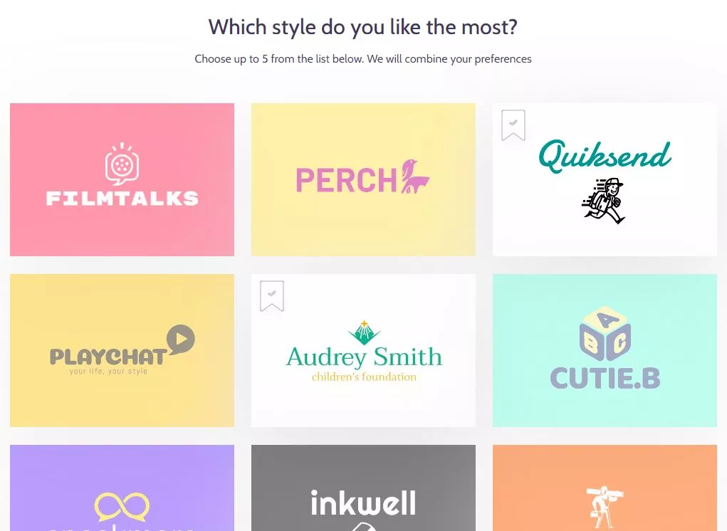 顏色色系選好之後,就進入重頭戲了,接著是要選擇你所喜歡的Logo樣式,這裡提供的樣式非常多,且風格都很特別,您可以選擇五個最喜歡的Logo樣式。按下「Next」繼續往下一步。
